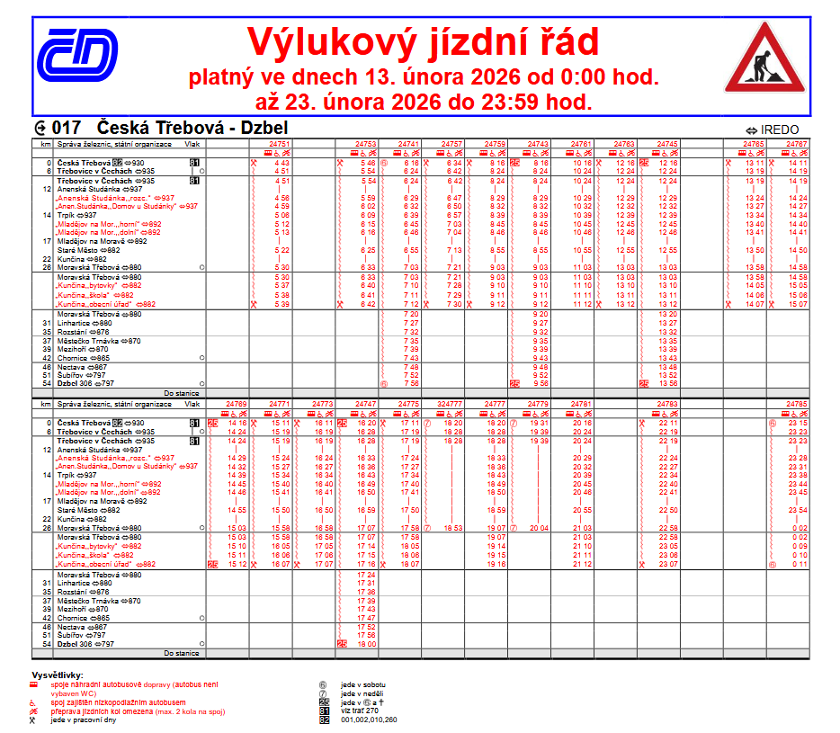 Provozovatel dráhy Správa železnic, s. o. informuje o nepřetržité výluce na železničních tratích číslo 017 a 270, která bude probíhat v úseku Česká Třebová - Třebovice v Čechách ve dnech 13. února 2026 od 0:00 hod. až 23. února 2026 do 23:59 hod..